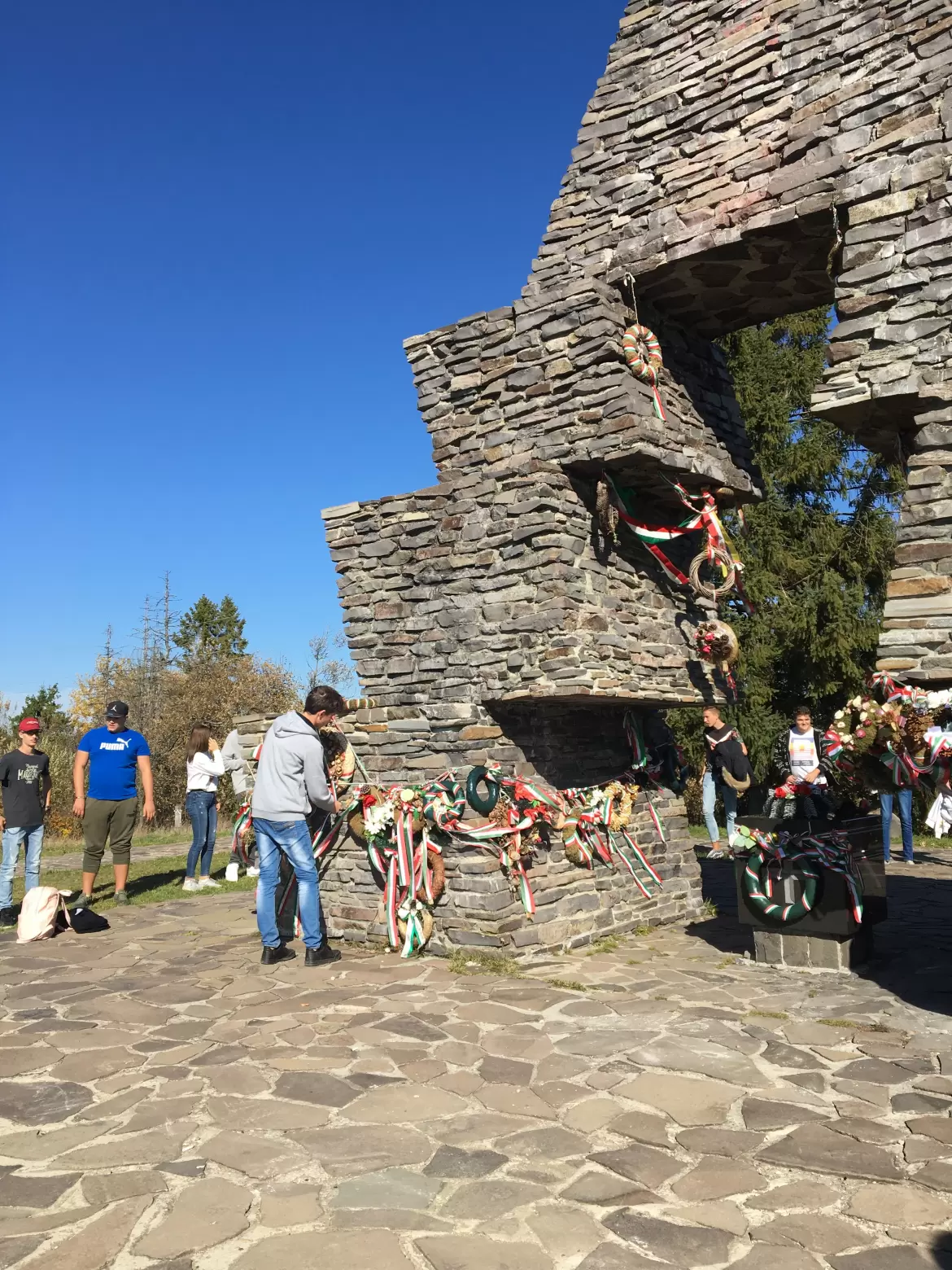 Látogatásunk következő célpontja a szolyvai emlékpark volt, ahol az 1944 őszén lágerbe gyűjtött 18 és 50 év közötti magyarok férfiakról emlékeztünk meg. Ezután tovább indultunk a hegyekbe, a Vereckei-hágó és a Millecentenáriumi emlékmű megtekintésének céljából. A hegyre felfelé menet rendkívül rossz volt az út, így a biztonság betartása érdekében nagyon lassan haladtunk, de cserébe így lehetőségünk volt gyönyörködni a hegyvidéki tájban és az apró falvakban. Nagyon szép, napos időben sikerült eljutnunk a Millecentenáriumi emlékműhöz, ahol énekszóval kísért megemlékezést tartottunk honfoglaló őseinkről, Magyarország múltjáról.