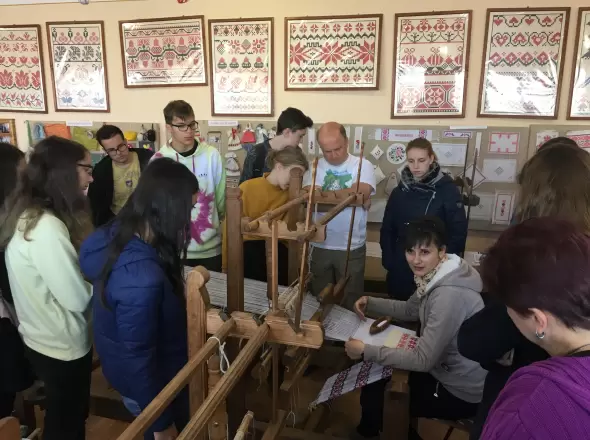 Negyedik napunkat a Nagyberegi Középiskolában kezdtük, ahol Furman Éva tanárnő mutatta be nekünk először az iskolát, majd az iskolában is tanított szövés hagyományát és jelentőségét a környéken. Az iskola a mai napig tanítja a 11-12. osztályos diákoknak szövést, akiknek gyönyörű munkáik ki is vannak állítva. Miután nekünk is lehetőségünk volt kipróbálni a szövést, az alsóbb évesek szüreti mulatságra készülő előadását tekinthettük meg. Egy kedves történet, népdalok és néptánc adta a műsor alapját, melyet kitörő lelkesedéssel fogadtak a budapesti és veresegyházi diákok.